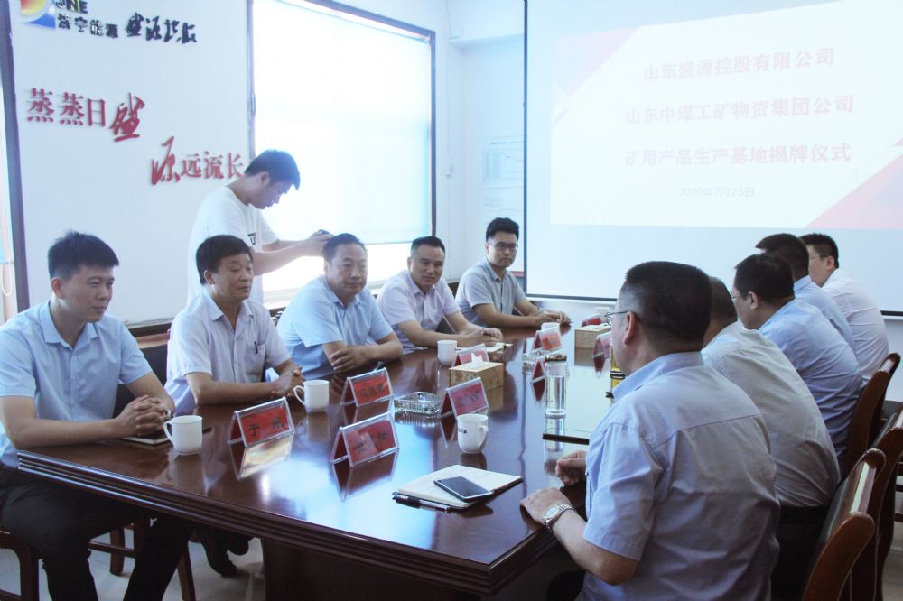 7月25日上午,山东中煤工矿物资集团总经理韩勇一行五人到盛源公司参观交流,并进行了“山东中煤集团矿用产品生产基地”揭牌仪式。盛源公司董事长、总经理陈宏,副总经理欧阳金矿及相关企业负责人陪同。