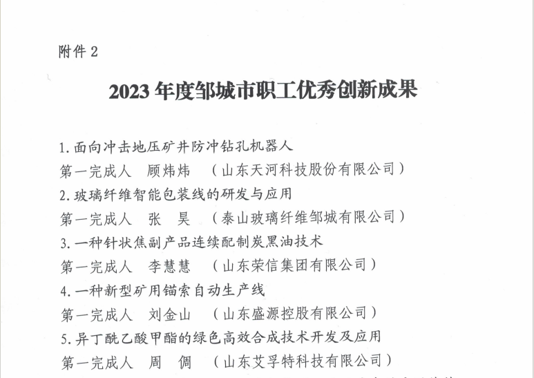近日,邹城市总工会公布了《2023年度邹城市劳模和工匠人才创新工作室、职工创新成果名单》,山东盛源控股有限公司“刘金山创新工作室”成功获评,并凭借自主研发制造的新型矿用锚索自动生产线被认定为“创新成果”。